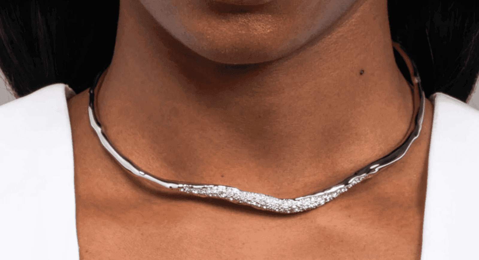 Necklines create opportunity. Alexis Bittar’s bridal necklaces complement plunging gowns, bateau necklines, and modern square cuts with sculptural brilliance.