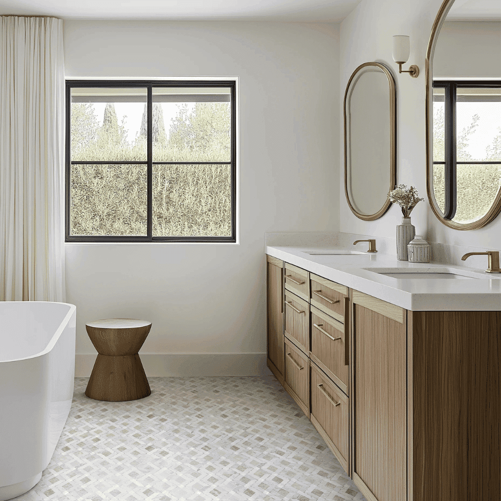 - Wood vanities or shelving for warmth