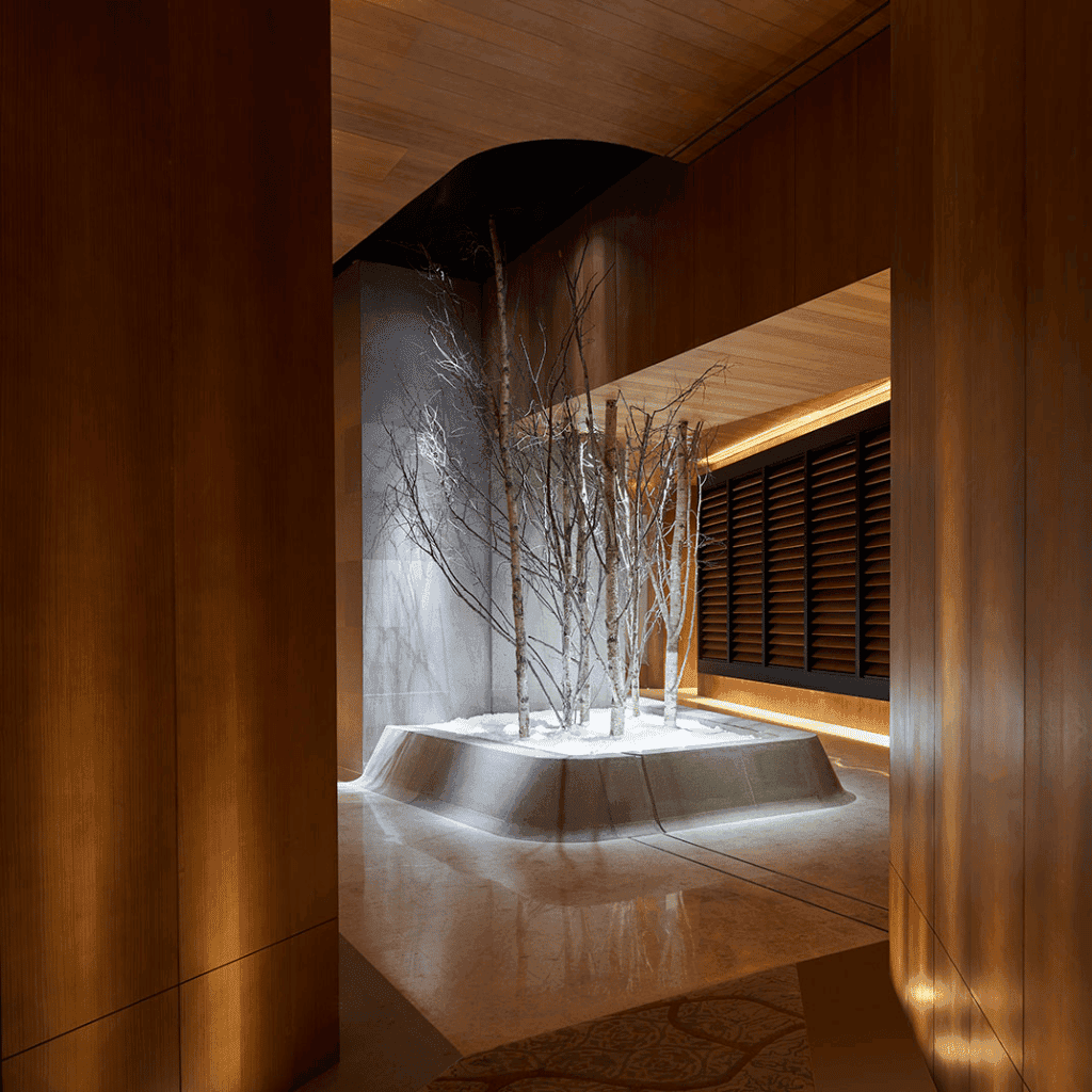 Upon arrival, guests are immediately immersed in the hotel’s otherworldly atmosphere. The entrance unfolds into a soaring atrium where dramatic angles, reflective surfaces, and sculptural staircases set the tone. Meanwhile, natural light pours in through the building’s vast voids, creating an ever-changing interplay of light and shadow.