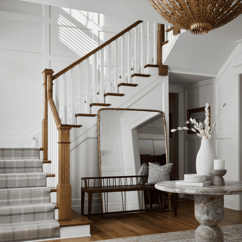 Mirrors are one of the most effective design tools in entryway interiors. They reflect light, expand visual space, and provide everyday convenience.