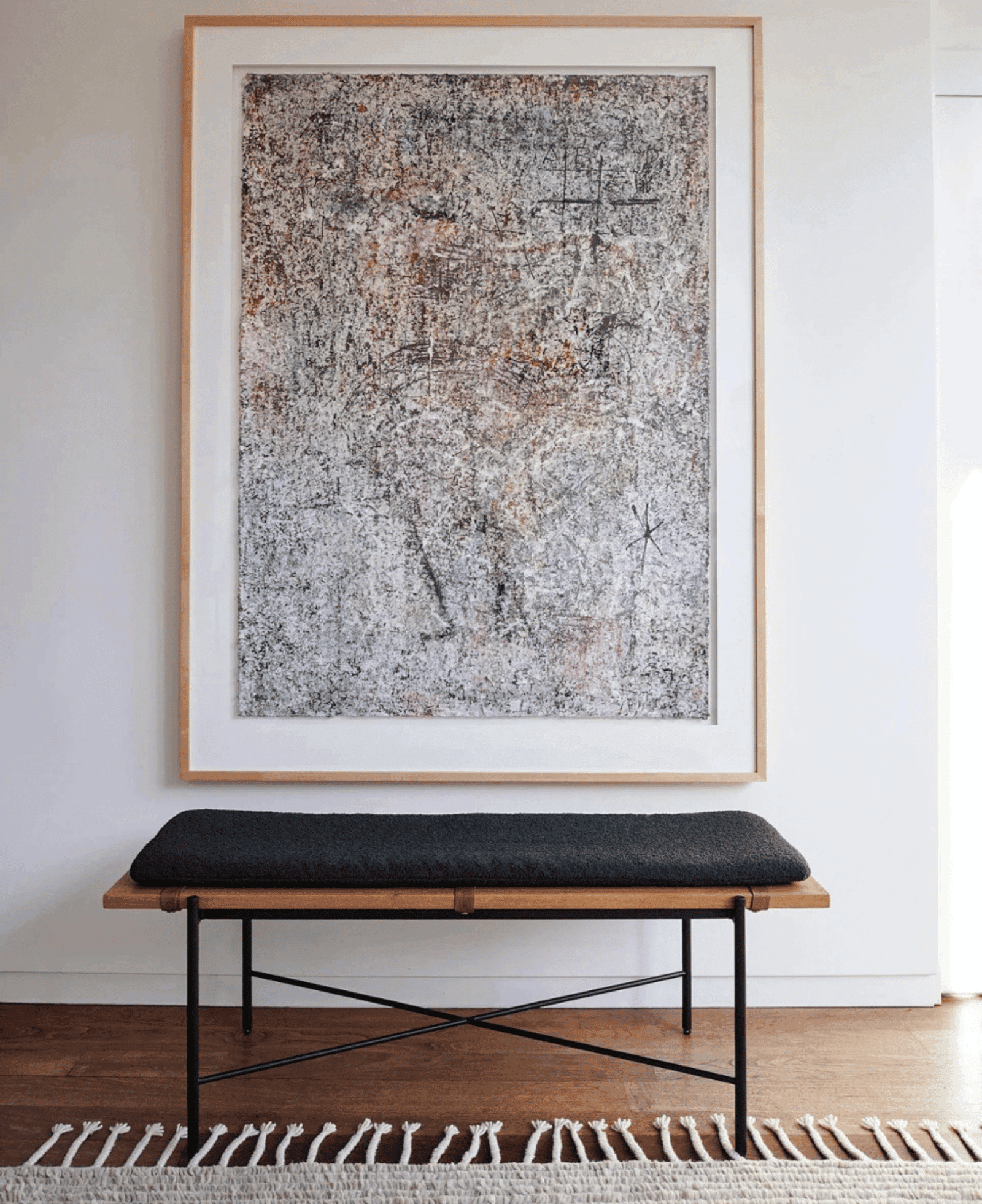 • One oversized artwork piece above a console table