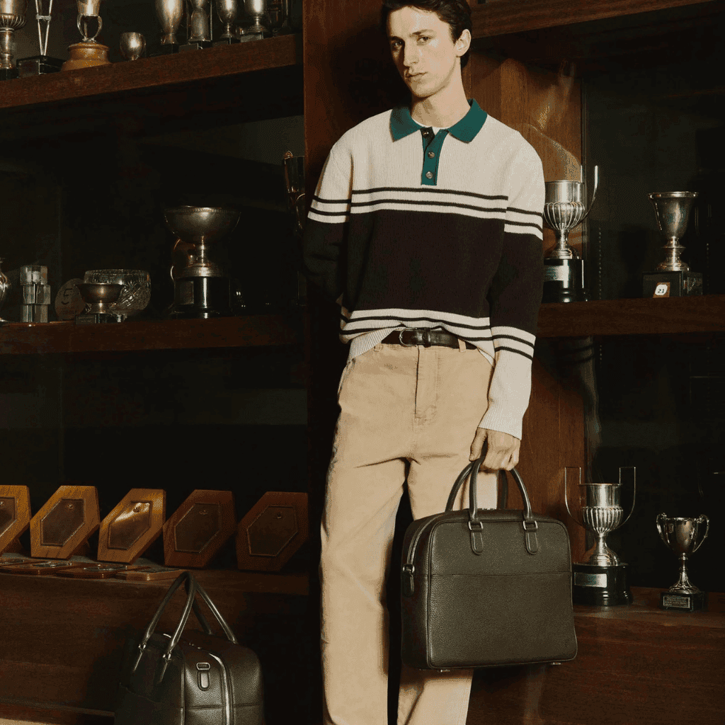 The silhouette remains clean and minimal. However, interior organization supports modern needs. Laptop compartments, document sleeves, and secure zip closures ensure functionality.